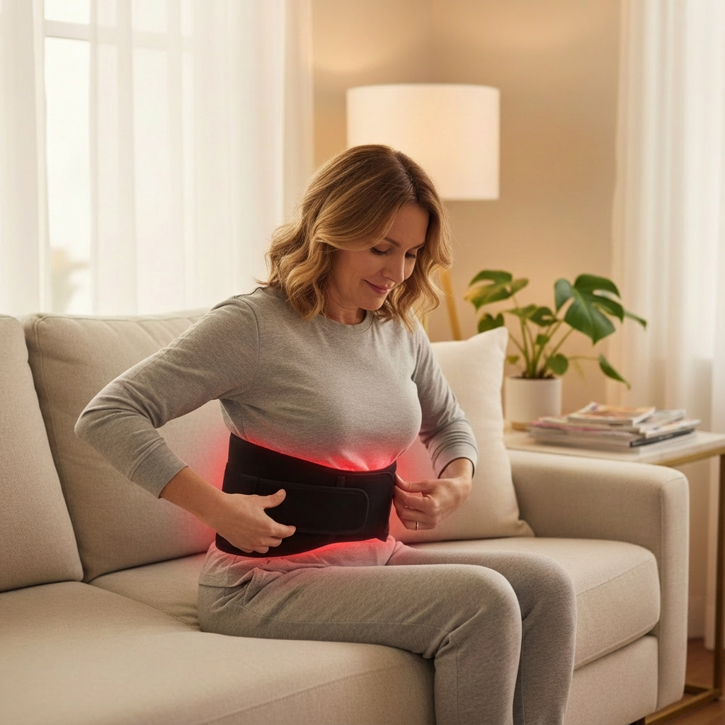 La lumière rouge aide à stimuler la peau et à améliorer son aspect. La compression ajustable procure une sensation de maintien et aide à relâcher les tensions musculaires.